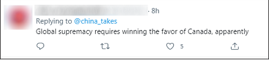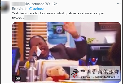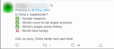 中国有核武器、即将成为世界最大经济体国家、有世界上最大的现役军队,但没有世界一流的冰球队,所以“抱歉,中国不是‘超级大国’,祝你下次好运!”