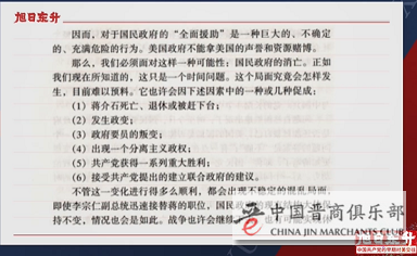这是美国头号的战略决策者、战略研究者、政策制定者对美国和当时国民党政府之间关系的一个判断。对于国民政府的“全面援助”是一种不确定的、充满危险的行为,美国政府不能拿美国的声誉和资源赌博。后面的结论很清楚,国民政府的消亡只是一个时间问题。