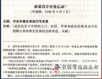 另外一个文件是1948年9月7号的《政策设计室备忘录》,作者乔治·凯南。他写的这份《评估和确定美国对华政策》对中国的人口、经济、军事、政治形势和1945年日本投降以来事态的发展做了总体的评估。里面结论的部分介绍了美国跟蒋介石的关系: