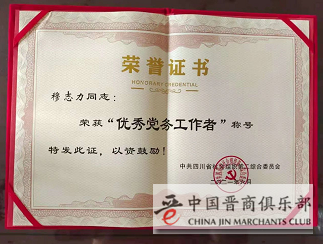 四川省山西商会(中国晋商俱乐部联合发起机构)党支部被评为先进基层党组织,穆志力副书记荣获“优秀党务工作者”称号。