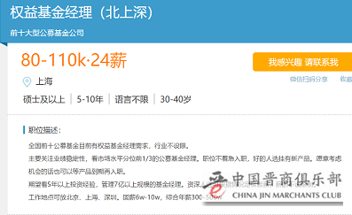 管理着22万亿元的国民钱袋子,基金经理们的待遇自然不低。对一位成熟基金经理来说,百万年薪只是起步价。以下是一家前十公募基金的权益基金经理招聘信息,要求五年经验以上,业绩稳定在市场前三分之一的分位值,开出的报酬则在300万-500万年薪之间。