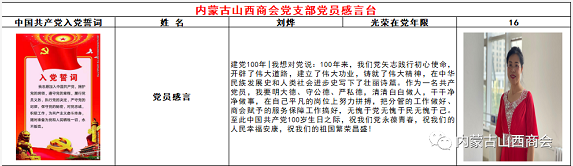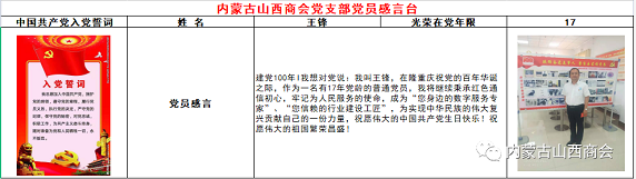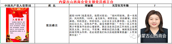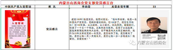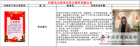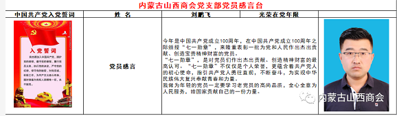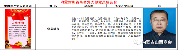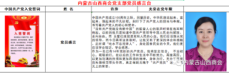 现将部分党员同志的在党感言转载如下,希望商会会员及会员单位向他们学习,以此为榜样,加强商会的全面建设,践行企业的社会责任与担当,为蒙晋两地的社会经济发展做出应有的贡献。