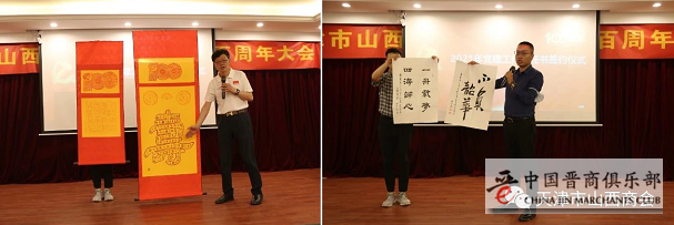 副会长单位天津惠记大地投资有限公司王安民董事长、理事单位天津环能电力工程有限公司孔祥侃总经理先后将为庆祝建党100周年而创作的篆刻、书法作品献给商会党委。