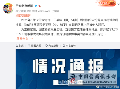警方通报表示,2021年6月12日12时许,王某年(男,54岁)到朝阳公安分局奥运村派出所报案,称6月6日其和吴某蓉(女,85岁)在朝阳区某小区被他人殴打。