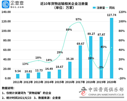 数据显示,近10年来我国货物运输相关企业年注册量总体呈增长趋势,2017年增长率为历年来最高,同比增长97%,注册量达69.67万家。2019年新增注册量87.87万家,同比下降2%。2020年注册量为历年来最高,新增127.74万家,同比增长45%。截至目前(6月23日)2021年共新增118.13万家相关企业。