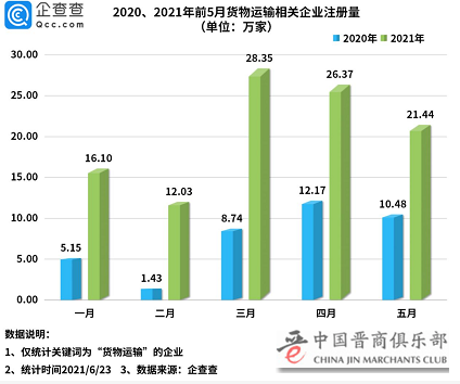 数据显示,今年1-5月共新增104.29万家货物运输相关企业,同比增长175%。其中一月注册量达16.1万家,同比增长213%。二月注册量略有下降,为12.03万家。三至五月平均注册量达25.4万家。