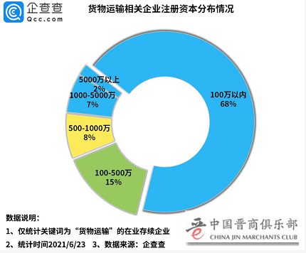 从注册资本来看,数据显示,我国超8成的货物运输相关企业注册资本在500万以内,其中68%注册资本在100万以内,另有15%的企业注册资本在100-500万,而注册资本在5000万以上的则占总量的2%。