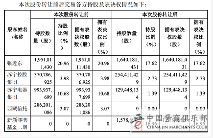 张近东、苏宁控股集团、苏宁电器集团、西藏信托拟将所持公司合计数量占上市公司总股本16.96%的股份转让给新新零售基金二期。其中,张近东将其所持公司2663万股、苏宁电器集团将其所持公司7900 万股通过大宗交易转让给新新零售基金二期;其余交易均系通过协议转让方式完成。