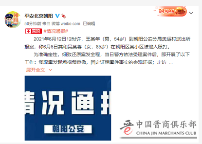 据@平安北京朝阳 7月5日通报:2021年6月12日12时许,王某年(男,54岁)到朝阳公安分局奥运村派出所报案,称6月6日其和吴某蓉(女,85岁)在朝阳区某小区被他人殴打。
