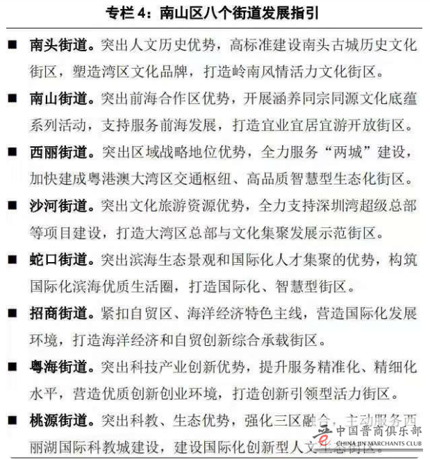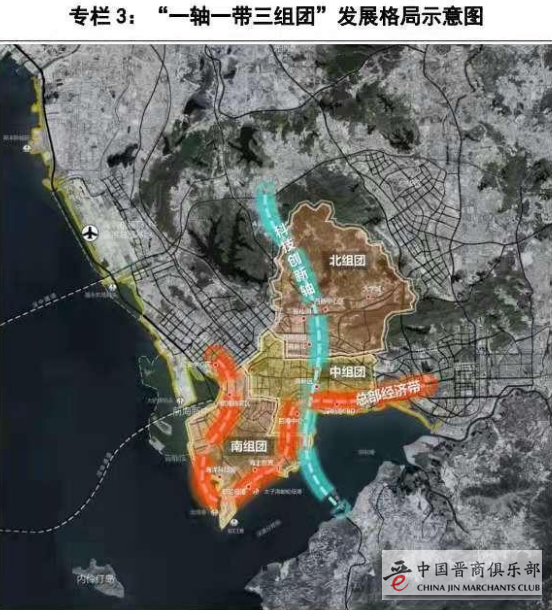 “三组团”为北部、中部和南部三大组团,北部组团涵盖西丽、桃源街道,以西丽湖国际科教城、西丽高铁新城为重点,打造集科研教育、高铁枢纽、生态涵养于一体的协调发展示范片区;中部组团涵盖粤海、沙河、南头街道,以高新区、华侨城片区、南头古城为重点,打造集高新技术、文化创意、文脉传承于一体的创新发展示范片区;南部组团涵盖南山、蛇口、招商街道,以前海、蛇口国际海洋城为重点,打造集深港合作、海洋经济、国际交往于一体的开放发展示范片区。