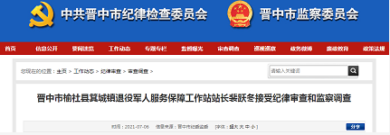 晋中市榆社县箕城镇退役军人服务保障工作站站长裴跃冬涉嫌严重违纪违法,目前正接受榆社县纪委监委纪律审查和监察调查。