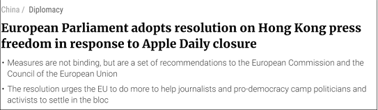 当天,欧洲议会以578票赞成、29票反对和73票弃权通过了这项动议。根据其官网发布的新闻稿,欧洲议会声称要以“最强烈的措辞”谴责“《苹果日报》关停并继续冻结其资产、逮捕其记者的行为”,其议员还妄称,“这是中国内地破坏香港自由社会、新闻自由、言论自由的又一举措”。