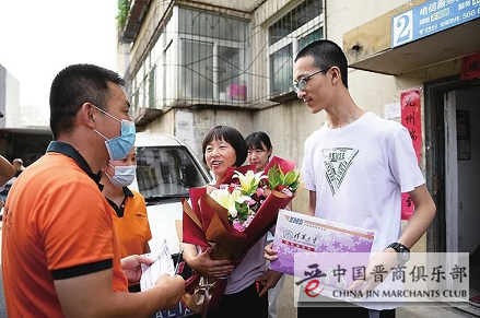 7月12日,山大附中的闫润杰同学从邮政EMS投递员手中接过了清华大学的录取通知书,成为全省第一批收到录取通知书的学子之一。全媒体记者 米国伟 摄