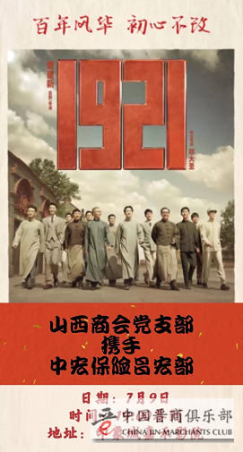 为庆祝中国共产党建党100周年,学习贯彻习近平总书记在庆祝中国共产党成立100周年大会上的重要讲话精神,深入开展党史学习教育,铭记革命历史,坚定理想信念,发扬优良传统。7月9日,苏州市山西商会(中国晋商俱乐部联合发起机构)党支部携手中宏保险昌宏部组织商会党员、入党积极分子和会员观看电影《1921》,深刻了解革命先驱者们如何于乱世探索真理,在至暗时刻寻找光明!