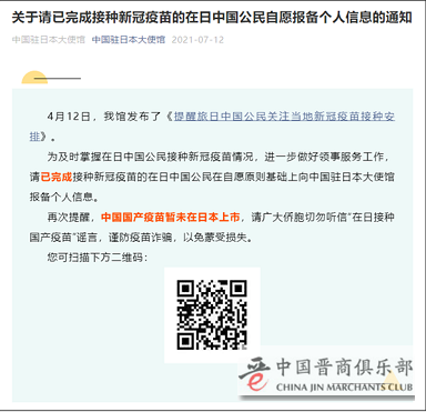 7月12日,中国驻日本大使馆微信公众号发文表示,为及时掌握在日中国公民接种新冠疫苗情况,进一步做好领事服务工作,请已完成接种新冠疫苗的在日中国公民在自愿原则基础上向中国驻日本大使馆报备个人信息。