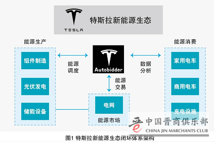 虚拟电厂智能平台Autobidder实现了在交易端与公用电网的连接,成为特斯拉构建新能源生态体系的基本依托,完成了在能源消费、能源生产和能源交易三大领域的系统化布局,最终形成“车+桩+光+储+荷+智”的新能源产业生态闭环(如图1所示)。