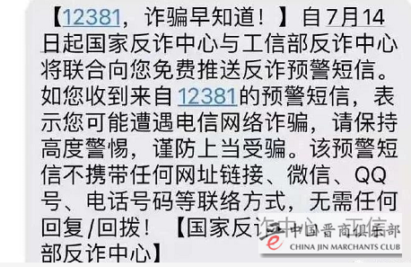 自7月14日起,国家反诈中心与工信部反诈中心将联合向您免费推送反诈预警短信。如您收到来自12381的预警短信,表示您可能遭遇电信网络诈骗,请保持高度警惕,谨防上当受骗。该预警短信不携带任何网址链接、微信、QQ号、电话号码等联络方式,无需任何回复/回拨!