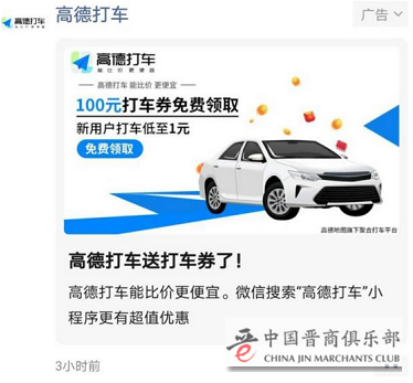 7月初,不少网友发现,高德打车广告出现在自己的朋友圈,在宣传其“能比价、更便宜”的同时,还宣布为司乘双方提供补贴。