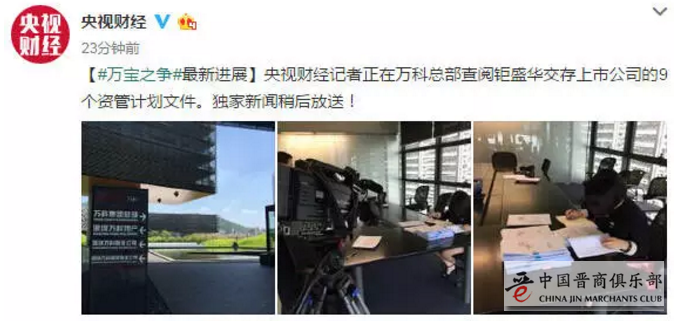 7月29日午间消息,据央视财经微博消息,央视财经记者已经进驻万科总部,正在查阅矩盛华交存上市公司的9个资管计划文件。