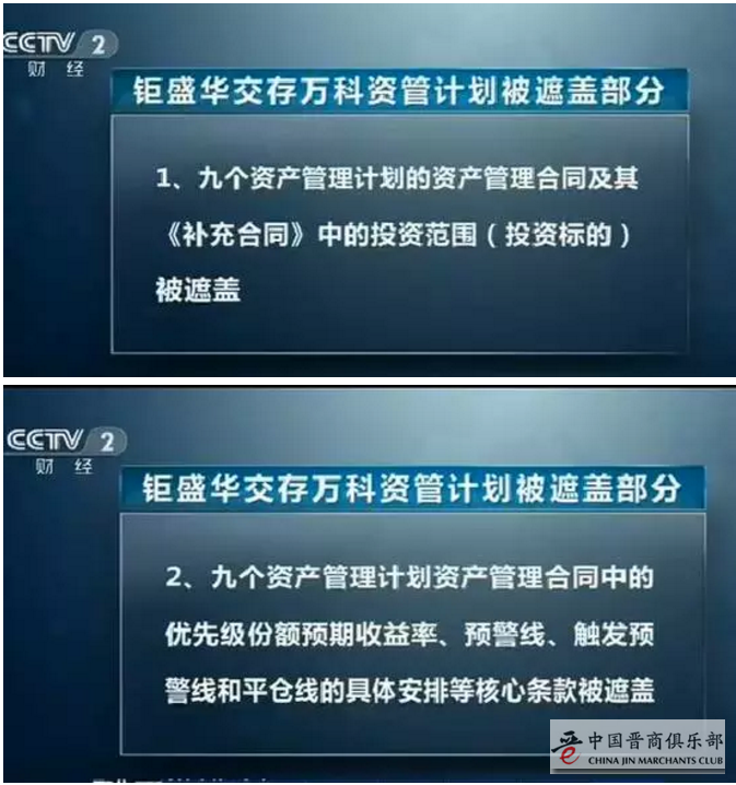 央视财经报道,记者在查阅钜盛华交存上市公司的9个资管计划文件时,表示多个关键信息被涂黑抹点,包括相关人物姓名、预期收益率等。