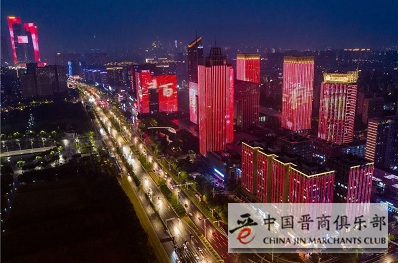 这是6月25日在南京市河西新城中轴线拍摄的庆祝建党百年主题灯光秀(无人机照片)。新华社记者 李博 摄