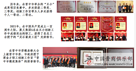 山西聚义实业集团工会主席朱明星讲到,自2014年“五小”竞赛活动开展以来,聚义集团积极响应,秉承“惟改革者进,惟创新者强,惟改革创新者胜。”的理念,以提高专业技术促经济效益,以增强创新能力促企业发展。“五小”工作以创新工作室为平台,充分发挥技术带头人的示范引领作用,在技术革新、攻关、成果转化和服务创新等方面取得了一定成果。迄今为止,聚义集团五小工作的开展,为公司节约成本费550万余元,人工费用350万余元,创造效益800余万元。获得机械类五小成果37项,建材类五小成果16项,科技类五小成果30项。发明专利2项,使用新型专利12项,外观专利8项。产生的直接和间接经济效益近两千万元。