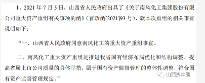 值得注意的是,为证明此次重组不涉及实控人变更,山西省政府于2021 年 7 月专门发函就南风化工本次重组的相关事宜作出说明:山西省政府同意南风化工的重大资产重组事宜,并表示南风化工重大资产重组是推进山西省国有经济布局优化和结构调整、提高省属上市公司质量的具体举措,属于国有资产监督管理的整体性调整,符合国有资产监督管理规定。