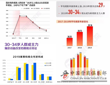 早在2018年,猫眼数据就复盘了2016年-2018年三年暑期档观众画像,指出“35岁以上观众占比逐年增加,24岁以下观众下降”的趋势,当时就有不少媒体对年轻人不去电影院提出了担忧。到了2019年暑期档,趋势仍在持续。在疫情来临前的2019年全年报告里显示,平均观影年龄持续上涨,首次达到29岁,同时,30-34岁观众成为新观影主力人群。