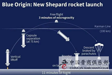 先乘火箭垂直起飞,成功飞越卡门线,体验了载人太空舱超过卡门线后的3分钟失重漂浮,最后依靠降落伞返回地球……尽管从飞船升空到返回全程只有10多分钟,但这已经足够秀出贝索斯的太空肌肉。