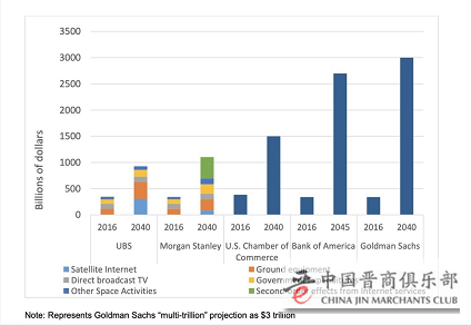 据UBS、摩根士丹利、高盛等机构的预计,太空经济规模在2040年可能高达3万亿美元。