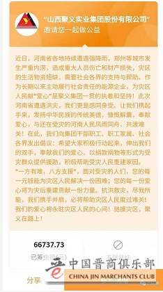 山西聚义实业集团股份有限公司在得知灾情后,第一时间组织干部职工通过“公益宝”为河南山省红十字会进行捐款,大家不仅将捐款链接主动分享到社交平台,还发动亲朋好友乃至社会各界奉献爱心。截至目前,聚义集团发起的捐款倡议已得到数万人响应,捐款金额达到66737.73元。