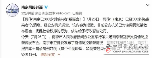 7月26日,网传“南京已经300多例感染者”的消息。经公安机关调查,该内容为捏造。目前公安机关已对该网民张某散布谣言、扰乱社会秩序的行为,依法给予行政警告处罚。
