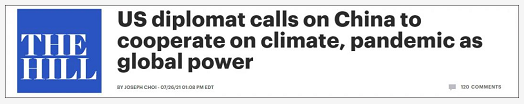 《国会山报》:美国外交官呼吁中国作为全球大国在气候、流行病方面进行合作