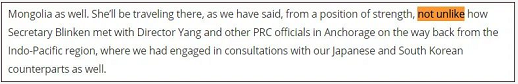 当时,来莱斯说,舍曼将“从实力的地位出发”(from a position of strength)飞往中国会谈,就像国务卿布林肯从印太地区回来的路上在安克雷奇会见杨洁篪和其他中方代表一样。