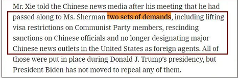 为了回避中方提出的“两份清单”,《纽约时报》直接在行文中写成谢锋副部长向舍曼提出两套所谓“要求”(demands)。