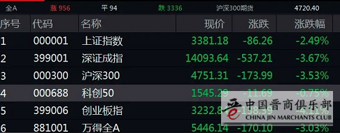 A股早盘三大指数短暂冲高,创业板指一度涨超1.5%,半导体板块大涨;午后指数持续走低,沪指跌破3400点整数关口,创业板指跌幅超过4%,两市超过3300只个股下跌。截至收盘,上证指数收于3381.18点,下跌2.49%;深证成指收于14093.64点,下跌3.67%;创业板指收于3232.84点,下跌4.11%。