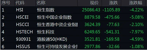除了A股,港股也有较大跌幅。恒生科技指数大跌近8%,恒生指数跌逾4%。腾讯控股跌约9%,阿里巴巴跌逾7%,美团跌近17%。