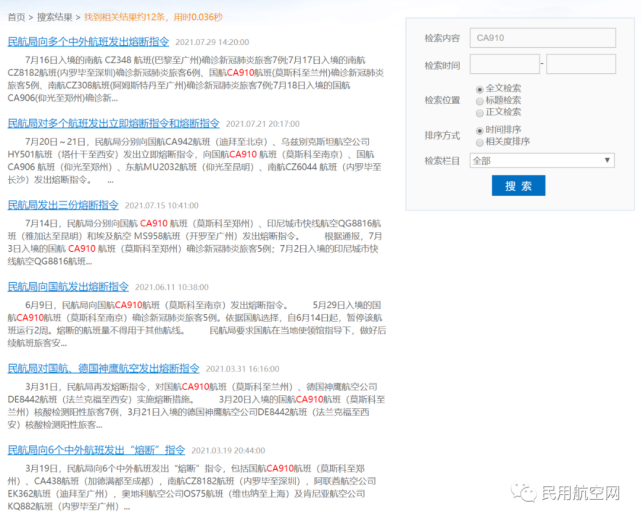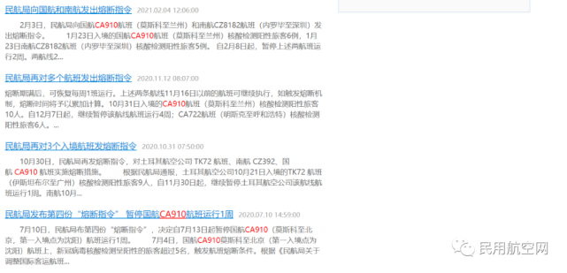 7月20日~21日,民航局向国航CA910航班(莫斯科至南京)等航班发出熔断指令。根据民航局通报,7月10日入境的国航CA910航班(莫斯科至南京)确诊新冠肺炎旅客7 例,自8月2日起,继续暂停国航CA910航班运行2周。