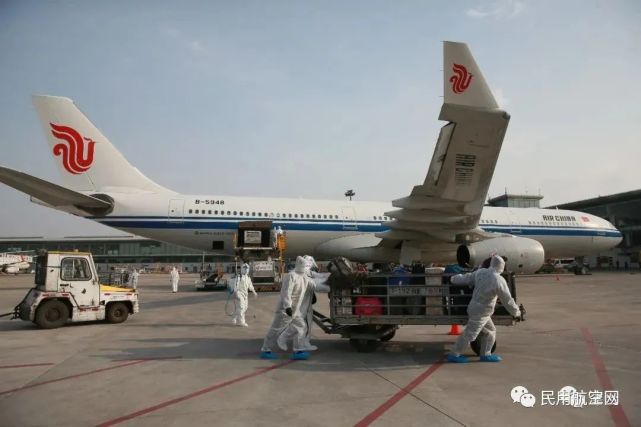 2020年3月21日,天津机场工作人员对落地的CA910航班执行防疫保障,图源:津云