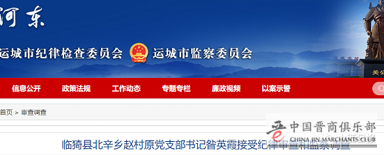 临猗县北辛乡赵村原党支部书记昝英霞涉嫌严重违纪违法,目前正接受临猗县纪委监委纪律审查和监察调查。