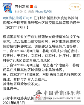 自2021年8月8日起,对尉氏县全域执行防控区管理,暂停与外界人员往来。