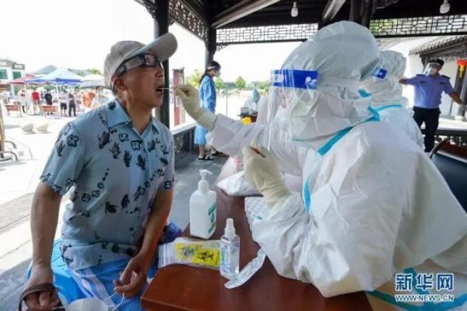 8月7日,市民在扬州市瘦西湖街道五亭社区瘦西湖西门采样点进行核酸检测取样。图来自新华网
