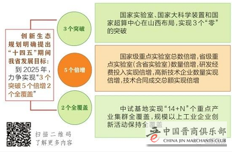 《创新生态规划》明确提出“十四五”期间我省的发展目标:力争实现“3个突破5个倍增2个全覆盖”,即到2025年,国家实验室、国家大科学装置和国家超算中心在山西布局,实现3个“零”的突破;国家级重点实验室总数倍增,省级重点实验室(含省实验室)数量倍增,研发经费投入实现倍增,高新技术企业数量实现倍增,技术合同成交总额实现倍增;中试基地实现“14+N”个重点产业集群全覆盖,规模以上工业企业创新活动保持全覆盖。从总体看,实现我省人才规模不断壮大,创新治理能力明显提升,创新文化新风尚基本形成。