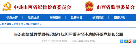 日前,经省委批准,山西省纪委监委对长治市黎城县委原书记杨红旗严重违纪违法问题进行了立案审查调查。