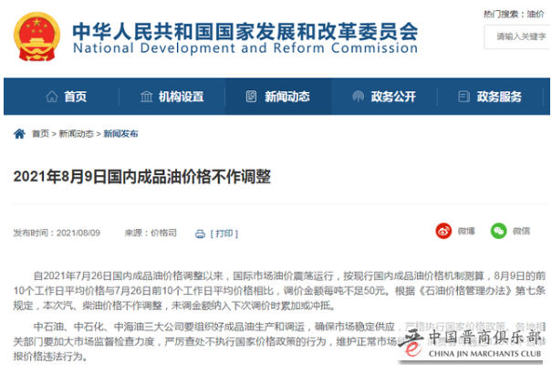 据国家发改委网站消息,自2021年7月26日国内成品油价格调整以来,国际市场油价震荡运行,按现行国内成品油价格机制测算,8月9日的前10个工作日平均价格与7月26日前10个工作日平均价格相比,调价金额每吨不足50元。根据《石油价格管理办法》第七条规定,本次汽、柴油价格不作调整,未调金额纳入下次调价时累加或冲抵。