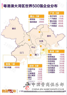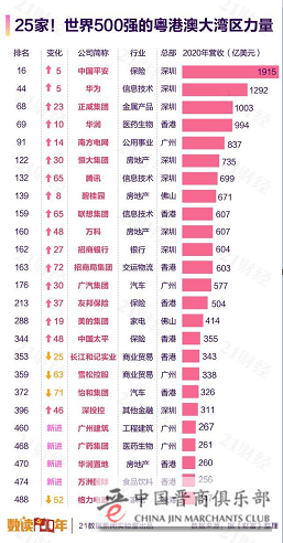2021年,粤港澳大湾区的世界500强企业达到25家,新增的4家分别为来自广州的广州建筑、广药集团,以及来自香港的华润置地、万洲国际。