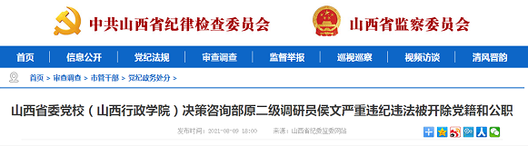 日前,经山西省纪委监委指定,大同市纪委监委对山西省委党校(山西行政学院)决策咨询部二级调研员侯文严重违纪违法问题进行了立案审查调查
