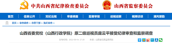 山西省委党校(山西行政学院)原二级巡视员庞云平涉嫌严重违纪违法,经省纪委监委指定,目前正接受大同市纪委监委纪律审查和监察调查。