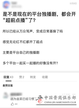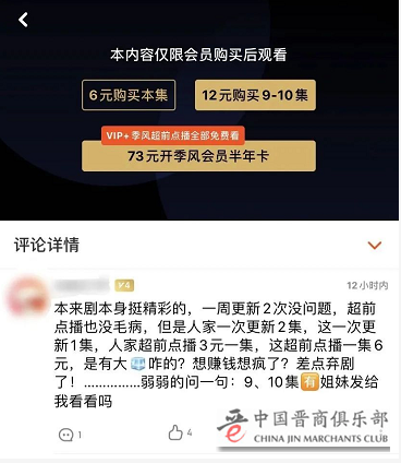 在不同的社交平台,不少网友都在吐槽这一现象“现在这些视频,超前点播=超钱点播,看部电视剧,一集6块钱,搞不懂”、“不得不吐槽一下现在的电视剧从十一集就开始超前点播。”