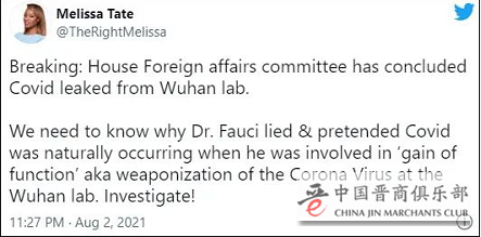除此以外,2日,拥有近46万推特粉丝的著名保守派作家梅丽莎·塔特(Melissa Tate)也与麦考尔等人打起了配合。她发布“突发”消息声称,“众议院外交事务委员会得出结论,武汉实验室泄露了新冠病毒”。